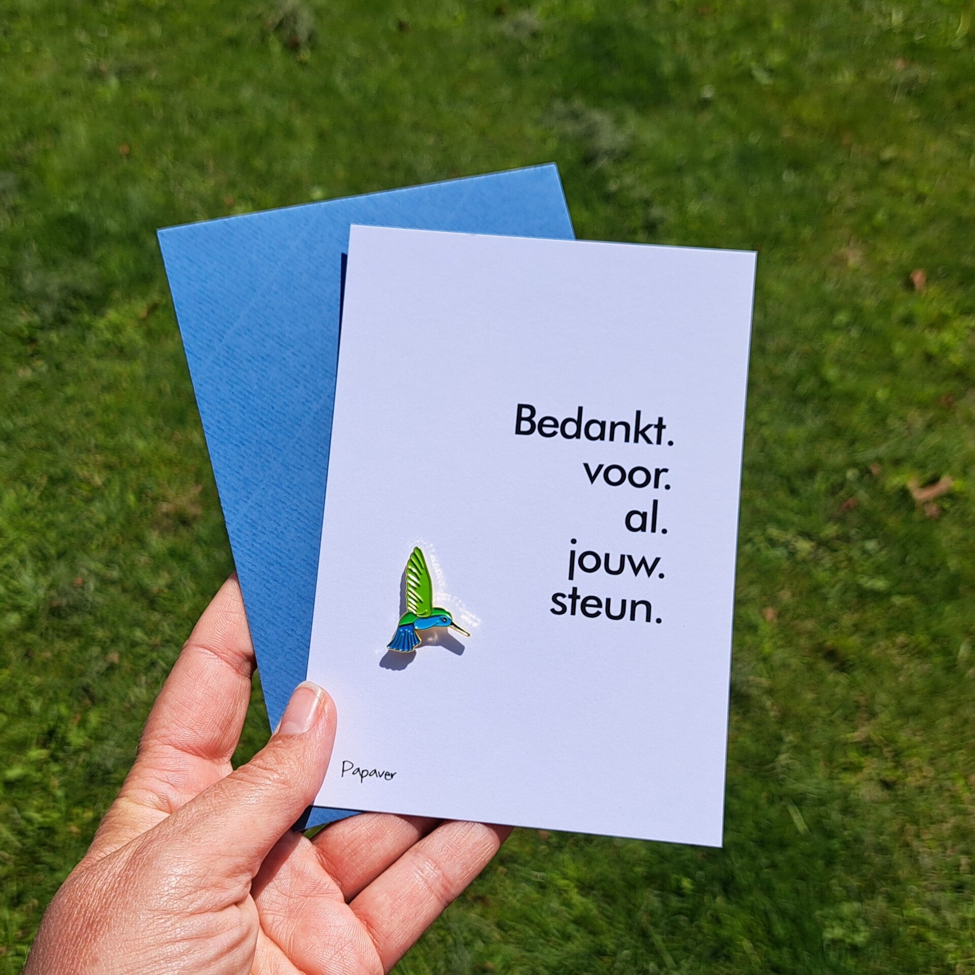 Wil je iemand een kaartje sturen, maar er ook een klein cadeautje bij doen? Dan is deze kolibri pin een leuk idee!